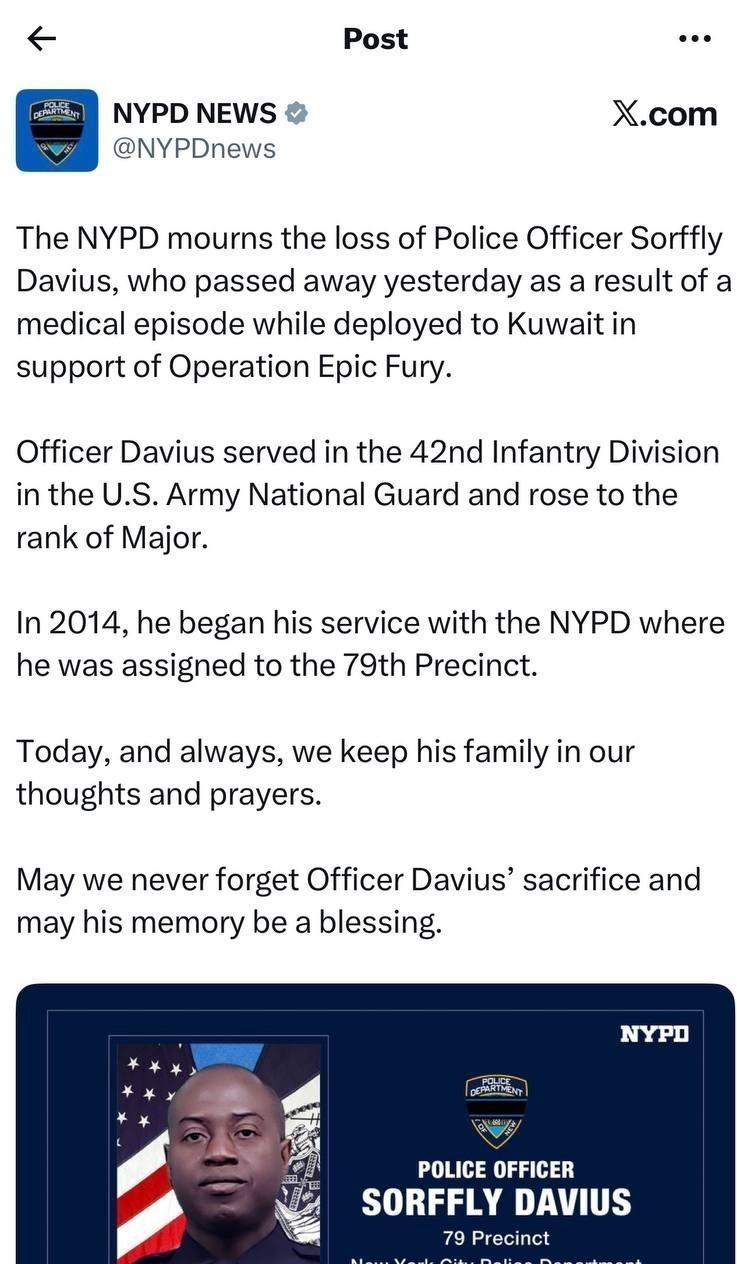 בהצהרת המשטרה נכתב: "משטרת ניו יורק מתאבלת על אובדן קצין המשטרה שלנו, סאולי דייוויס, שמת מסיבוך רפואי בזמן שהוצב בכווית."