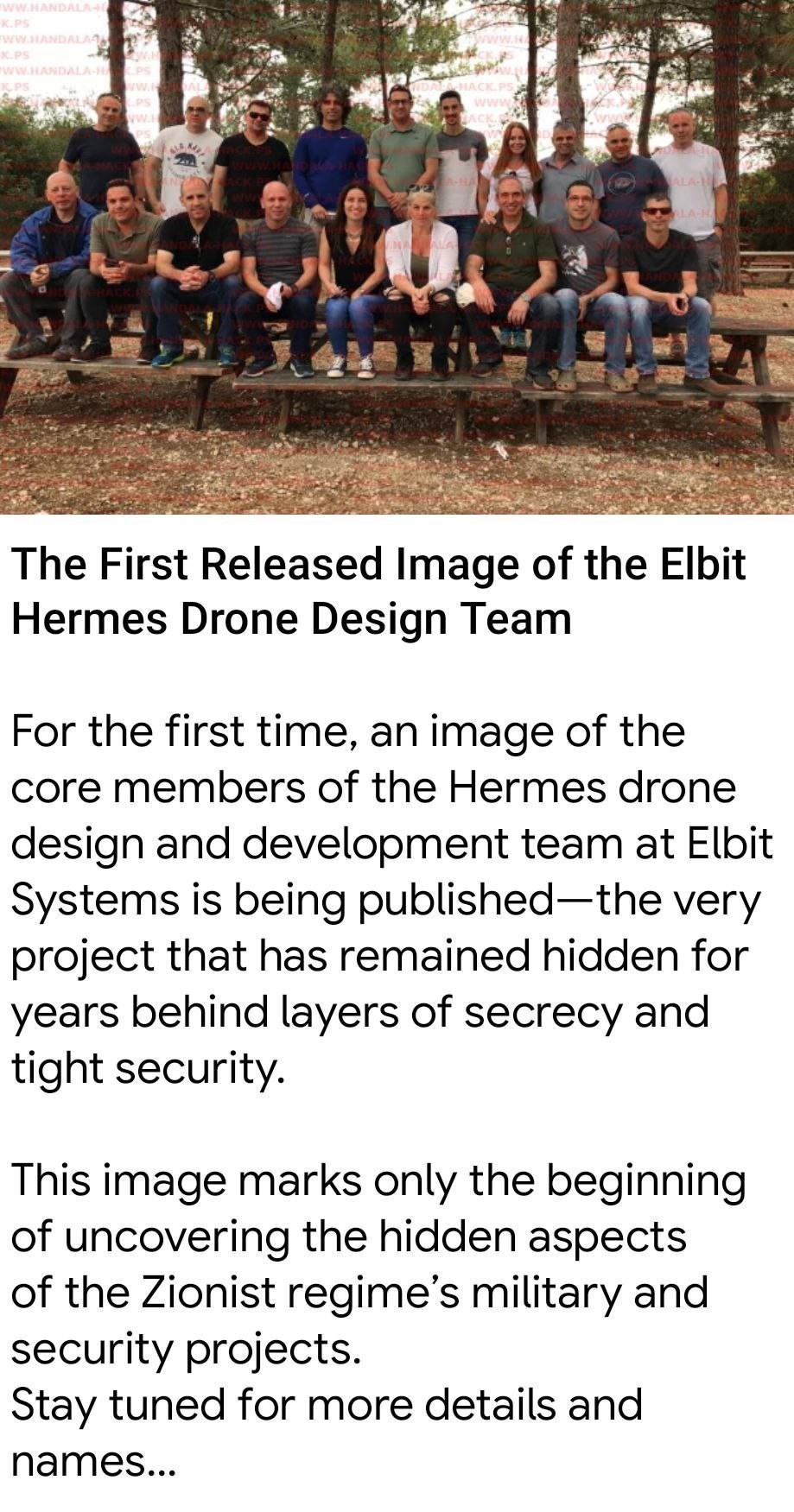 על פי סוכנות הידיעות טסנים, לראשונה, פורסמה תמונה של החברים העיקריים בצוות תכנון ופיתוח הרחפן של הרמס באלביט מערכות; פרויקט שהוסתר במשך שנים מאחורי שכבות של סודיות ואמצעי אבטחה מחמירים ומהווה חלק נסתר של הפרויקטים הצבאיים והביטחוניים הישראליים.