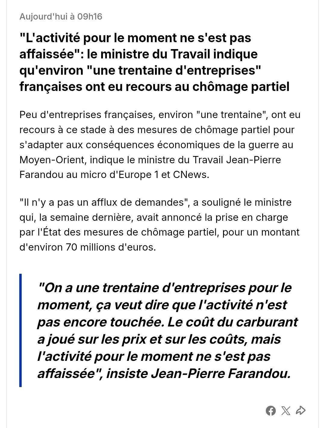 ז׳אן-פייר פאראנדו, שר העבודה של צרפת, אמר בריאיון לרדיו Europe 1 ול־CNews:  שמספר מצומצם של חברות צרפתיות, כלומר כ־"30 חברות", השתמשו בשלב זה בצעדי האבטלה החלקית כדי להסתגל להשלכות הכלכליות של המלחמה במזרח התיכון. הוא ציין כי "אין גל של בקשות", והוסיף כי בשבוע שעבר הודיע שהממשלה תישא בעלויות האבטלה החלקית, המוערכות בכ־70 מיליון אירו.