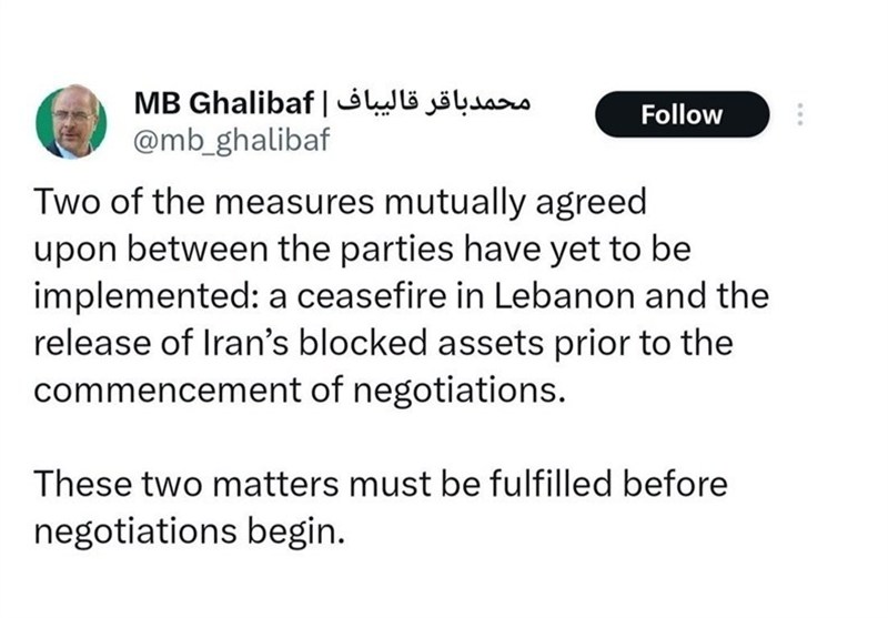 "שתי פעולות שהוסכמו בין הצדדים עדיין לא יושמו: הפסקת אש בלבנון ושחרור נכסי איראן המוקפאים — לפני תחילת המשא ומתן. שני נושאים אלה חייבים להתממש לפני תחילת השיחות."