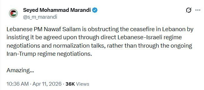 לפי דיווח סוכנות הידיעות טסנים, סייד מוחמד מרנדי, מומחה לעניינים פוליטיים, כתב בעמוד ה-X שלו: נוואף סלאם, ראש ממשלת לבנון, בכך שהוא מתעקש שהפסקת האש תושג באמצעות משא ומתן ישיר בין לבנון לישראל ושיחות לנורמליזציה של היחסים—ולא דרך המשא ומתן המתמשך בין איראן לבין ממשל טראמפ—מונע את השגתה.