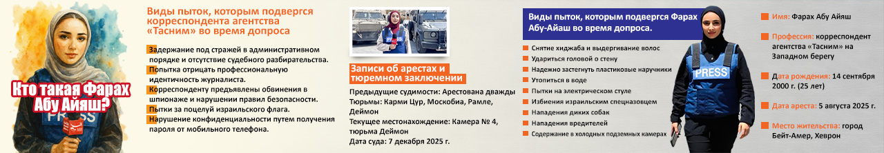 Палестинский корреспондент агентства «Тасним» Фарах Абу Айяш, арестованная 6 августа 2025 года в деревне Бейт-Уммар под Хевроном, уже более трёх месяцев находится в израильских тюрьмах, где подвергается жестоким пыткам, унижениям и психологическому давлению.